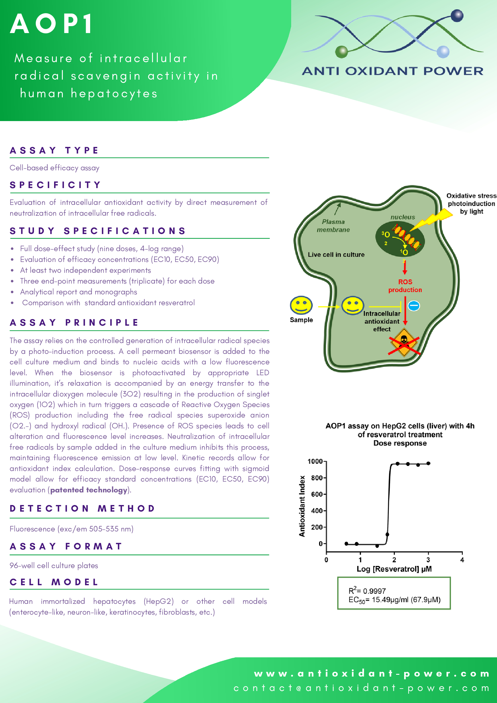 ANTIOXIDANT ACTIVITY : measure of intracellular ROS/ free radical scavenging activity. It provides antioxidant index, dose-response curve and efficacy concentrations allowing for ranking or comparison with standard antioxidants.