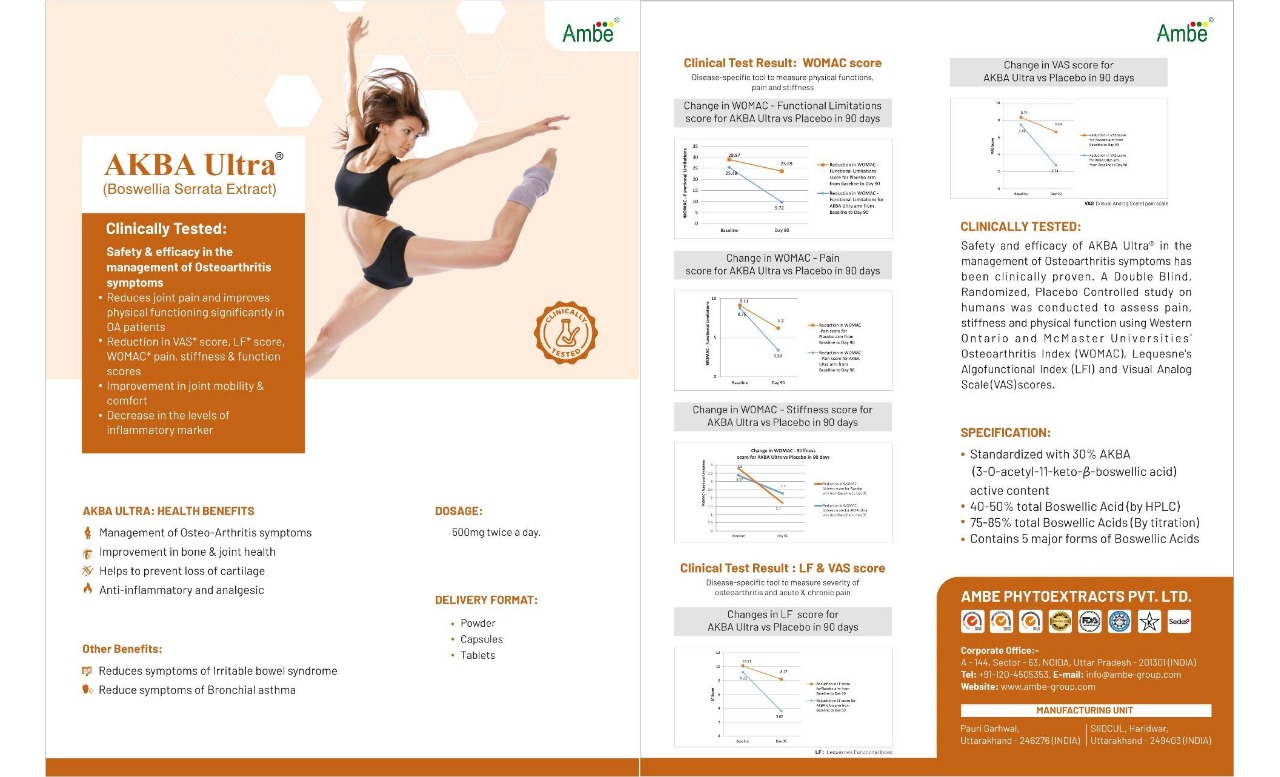 Clinically tested in management of osteoarthritis symptoms. It promotes Joints flexibility & comfort, Eases stiffness in joints &improves physical functioning or activities significantly in OA patient.