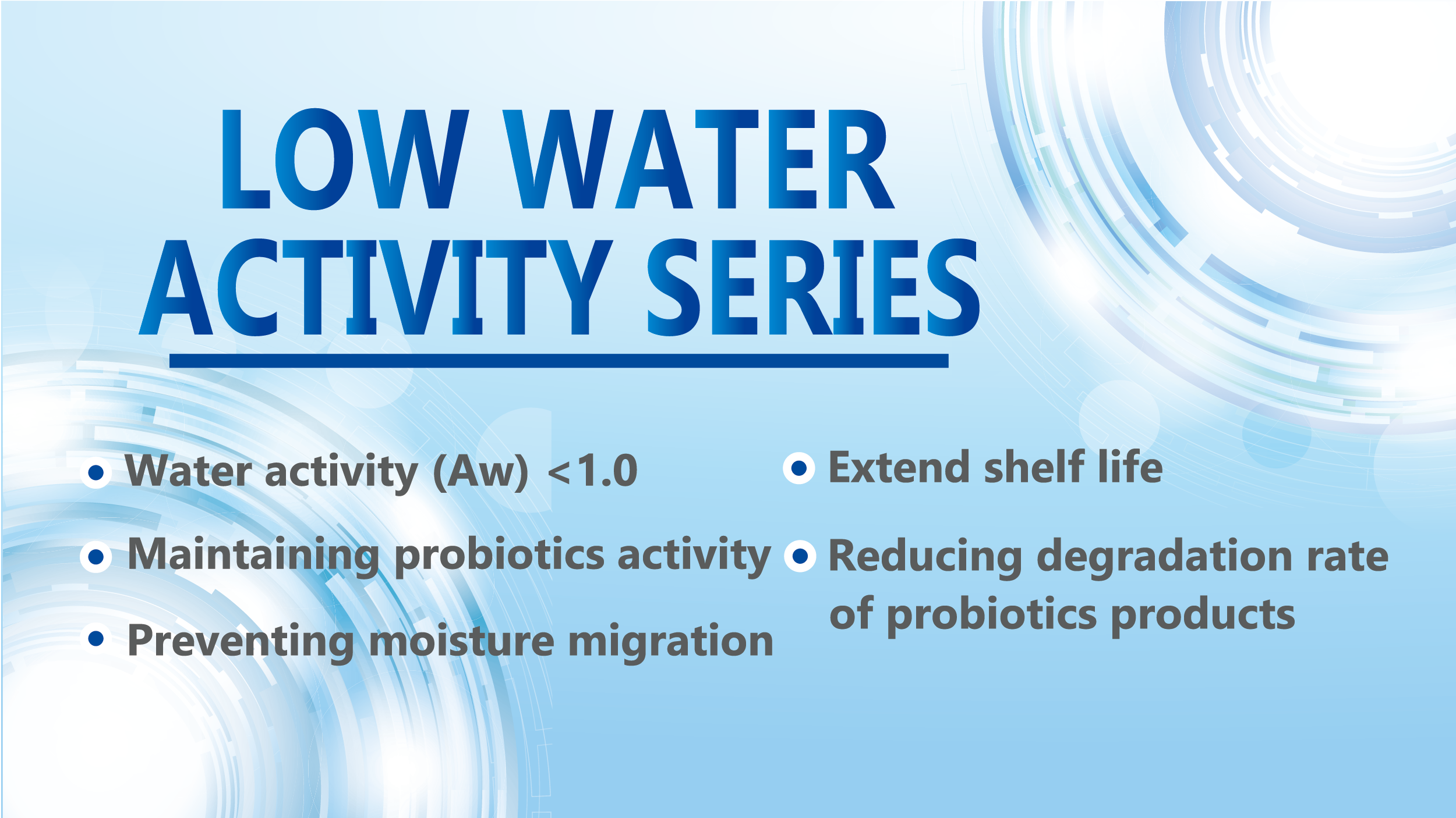 Water activity (Aw) of food is the ratio between the vapor pressure of the food itself, when in a completely undisturbed balance with the surrounding air media, and vapor pressure of distilled water under identical conditions. Most microbes do not grow at Aw below 0.6. Therefore, Aw is an important indicator for food safety and food quality. Besides, low Aw could also offer shelf life extension of dry probiotics products.