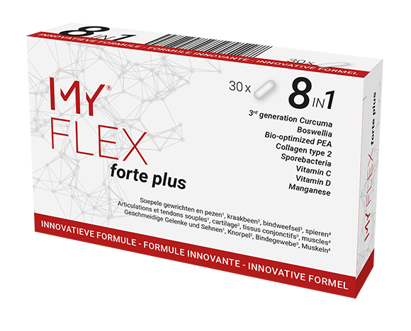 MY®FLEX forte plus promotes joint flexibility, connective tissue integrity, and muscle function using a synergistic mix of collagen-supportive nutrients, vitamin C, magnesium, and spore-forming probiotics. Suitable for individuals with joint discomfort, tendon stress, or those seeking long-term mobility support.