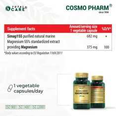 Mg: 375 mg, 100% of DV.• Vit. B6: 5 mg, 357% of the DV.• 90 allergen-free vegetable capsules, no titanium dioxide.• Mg reduces fatigue, exhaustion, helps the nervous system, the metabolism, the skeletal system, the muscular system. It supports the metabolism, it has antioxidant properties. Vit. B6 contributes to normal functioning of the nervous system, maintaining mental health, metabolism, synthesis of cysteine, and the process of cell division.• 1 cps/day after a meal, suitable for vegetarians.• Do not use it as a substitute for a varied and balanced diet and a healthy lifestyle. Do not exceed the recommended daily intake. Kept out of reach of children. It is advised to consult a healthcare practitioner before use if pregnant, nursing, taking any medication, or having any medical condition.• Store in a cool, dry place.• Bottle 100% biodegradable, made from plants.• SIMAG™ 55 is a registered trademark of Nexira.• Certified: HALAL CERTIFICATE, ISO 9001, ISO 14001, and ISO 22000.