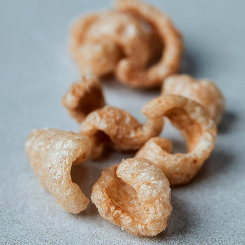 Pure pork skin strips and pellets are ready to be popped and turned into delicious snacks.