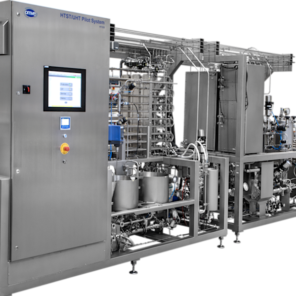 The configuration includes OMVE’s HT320 UHT system with different holding times and direct steam injection (DSI), our HP303 high-pressure homogenizer and our FS212 aseptic filling bench.