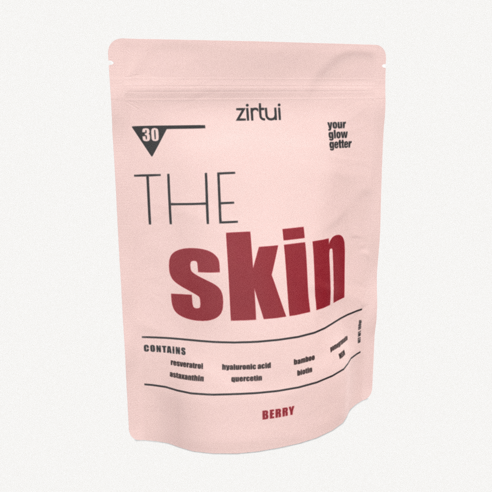 Our skin is the largest organ of our body and is the first barrier against negative external influences. Collagen, the primary building block of our skin plays a significant role in the structure of our skin. As we age, the production of collagen naturally decreases. Collagen supplementation has been praised by many as a solution to overcome this decline. However, there are drawbacks linked to collagen supplementation. Collagen is a large protein, and it has not been proven that ingested collagen ends up in our skin layers. We firmly believe in collagen, but not in external collagen supplementation. That is why we developed THE skin: an innovative and patented formula that supports and increases internal collagen production.  THE skin is a nutraceutical blend comprising natural collagen boosting ingredients with essential collagen building blocks. Prebiotic fiber suports the gut-skin axis while favonols and polyphenols provide an anti-inflammatory action.
