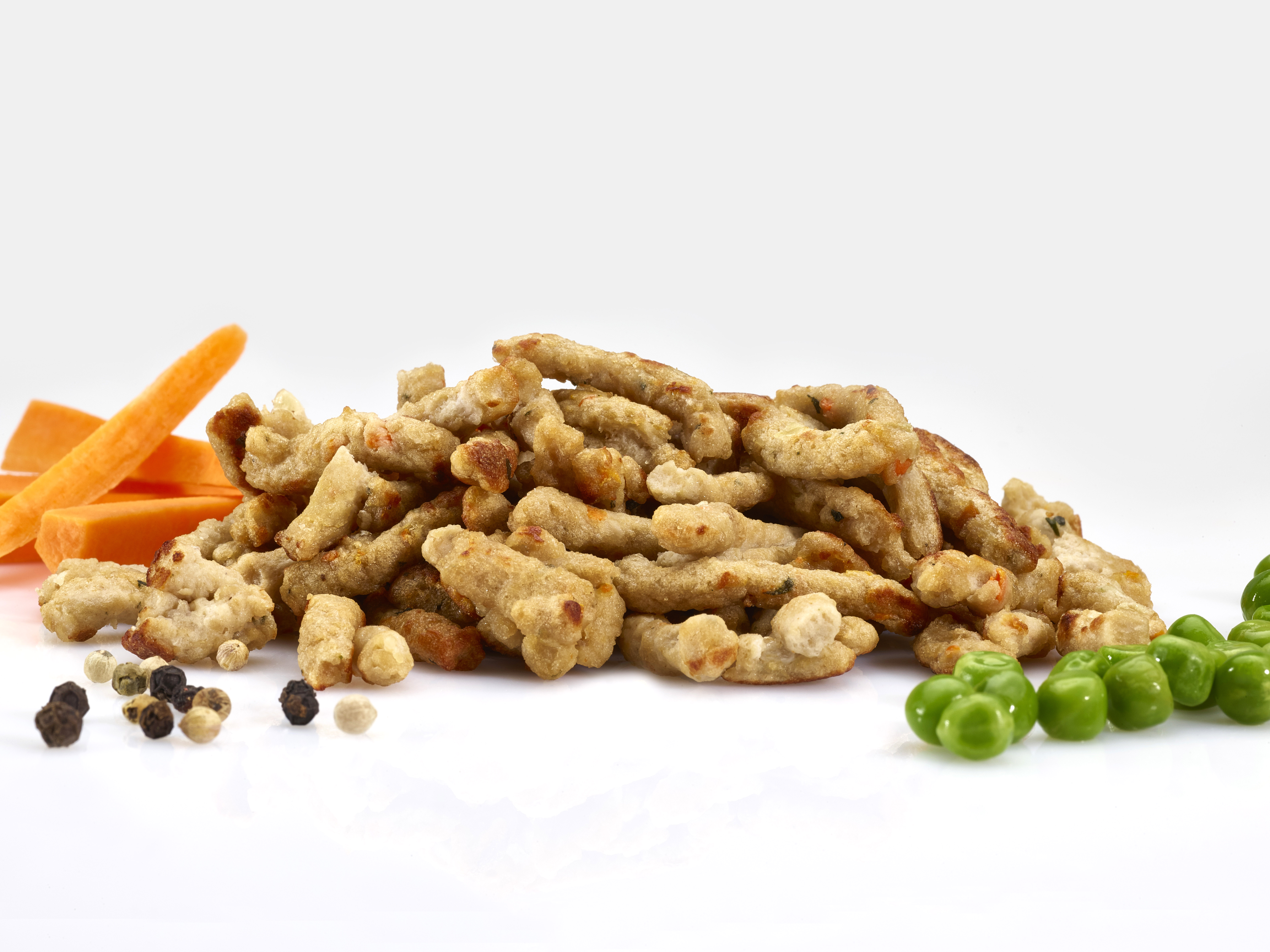 Delivered cooked, IQF, from pea, wheat or soy proteins.The preparations consist in minced veggies and veggie "meat" balls.